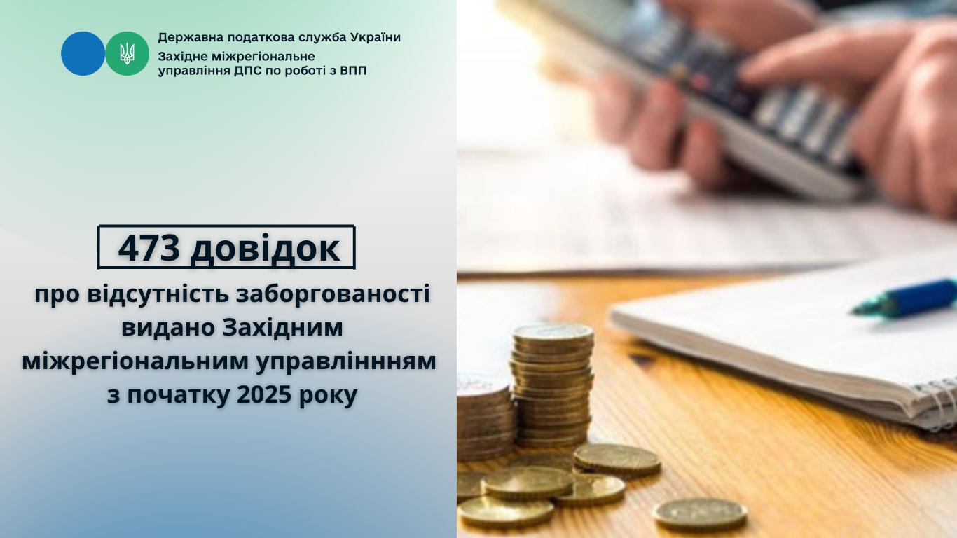 Упродовж десяти місяців 2025 року Західним міжреіональним управління ДПС по роботі з великими платниками податків видано платникам 473 довідок про відсутність заборгованості з платежів, контроль за справлянням яких покладено на контролюючі органи.