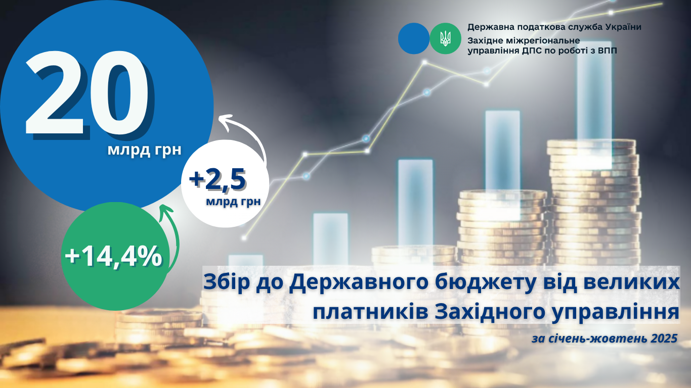 Протягом десяти місяців 2025 року великі платники податків Західного міжрегіонального управління ДПС перерахували до загального фонду Державного бюджету майже 20,0 млрд гривень. Ця сума, у порівнянні з аналогічним періодом 2024 року, є більшою на 14,4% або + 2,5 млрд гривень.