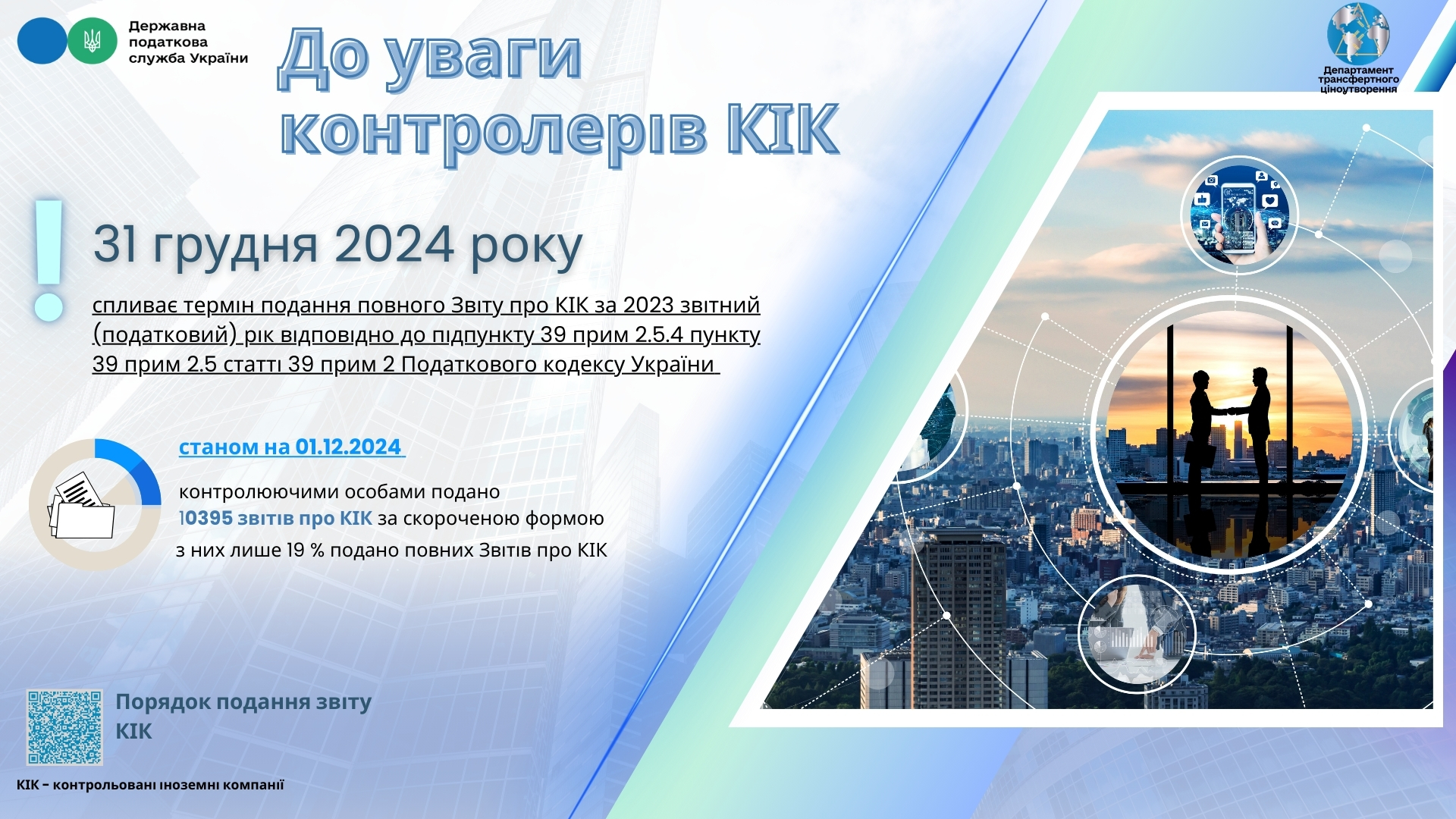 Звертаємо увагу контролерів КІК, що 31 грудня 2024 року спливає термін подання повного Звіту про контрольовані іноземні компанії (далі – КІК) за 2023 звітний (податковий) рік відповідно до підпункту 392.5.4 пункту 392.5 статті 392 Податкового кодексу України (далі – Кодекс).