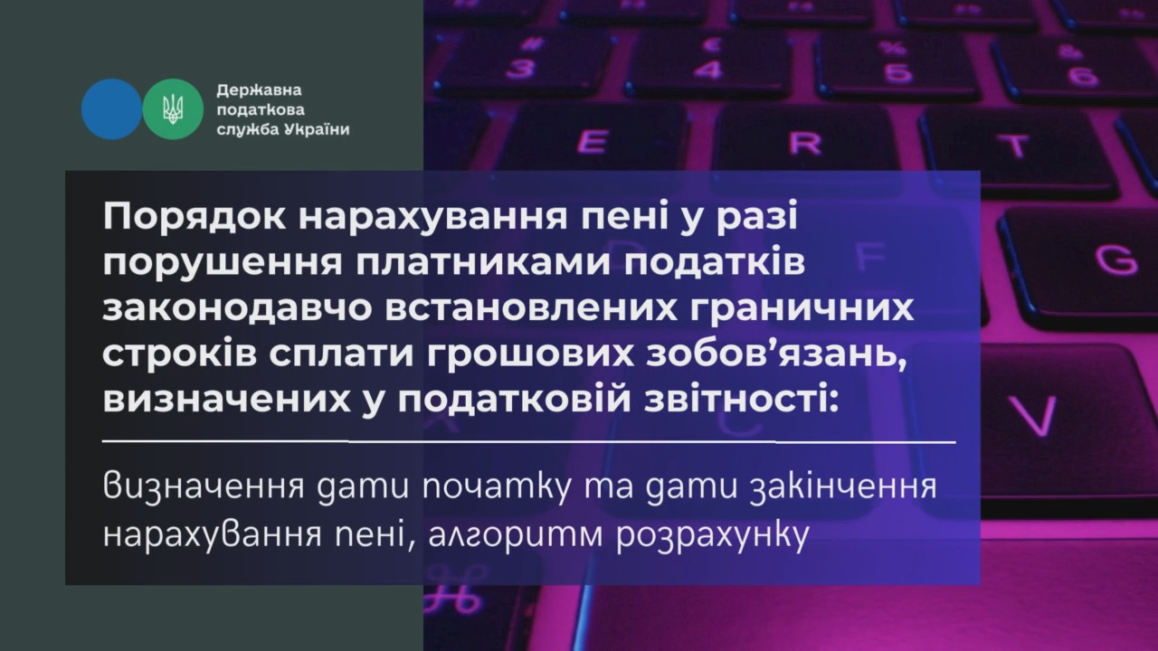 ДПС розроблено відеоролик «Порядок нарахування пені у разі порушення платниками податків законодавчо встановлених граничних строків сплати грошових зобов’язань, визначених у податковій звітності: визначення дати початку та дати закінчення нарахування пені, алгоритм розрахунку пені»