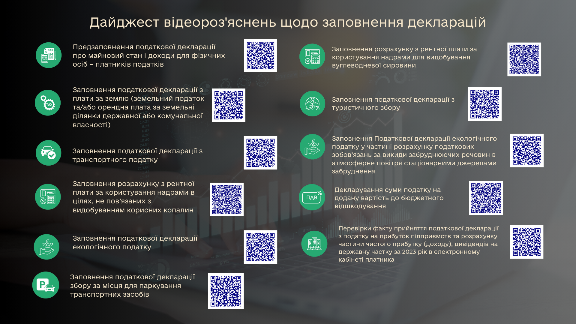 Пропонуємо платникам скористатися інфографікою, в якій для зручності та легкості використання розроблені відеоролики структуровані з QR-кодом.