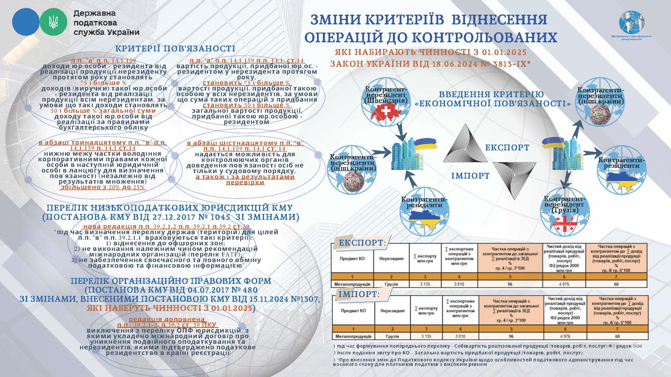 Крім того, з 01.01.2025 згідно з абзацом сьомим підпункту 1 пункту 2 розділу І Закону № 3813 до абзацу шістнадцятого підпункту «в» підпункту 14.1.159 пункту 14.1 статті 14 будуть внесені зміни щодо можливості для контролюючих органів доказувати пов’язаність осіб не тільки у судовому порядку, а також і за результатами перевірки.
