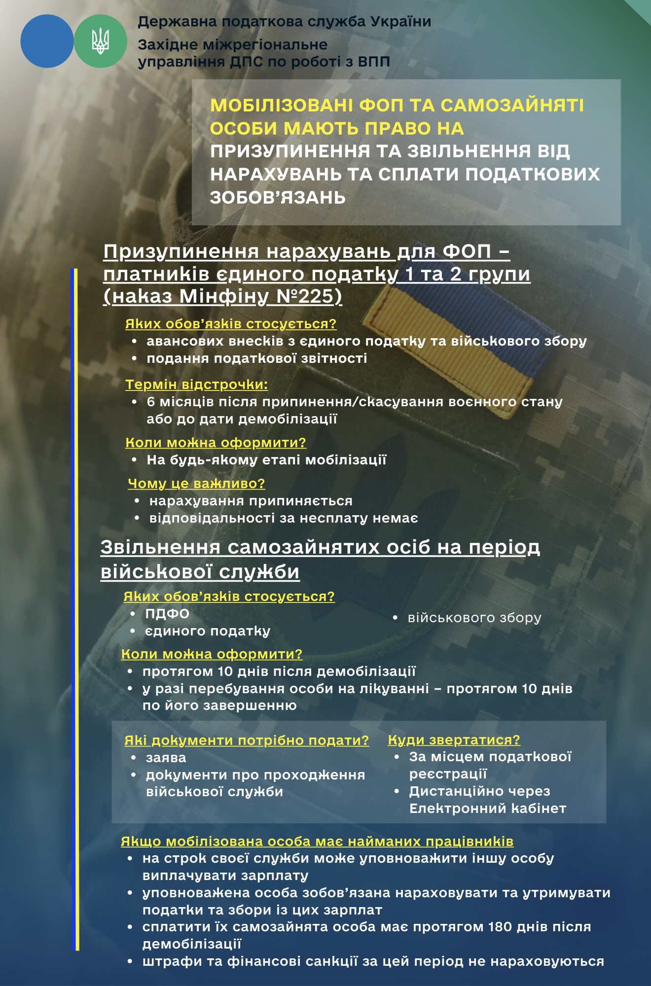 Західне міжрегіональне управління ДПС по роботі з великими платниками плдатків інформує про те, що мобілізовані ФОП та самозайняті особи мають право на призупинення та звільнення від нарахувань та сплати податкових зобов'язань.