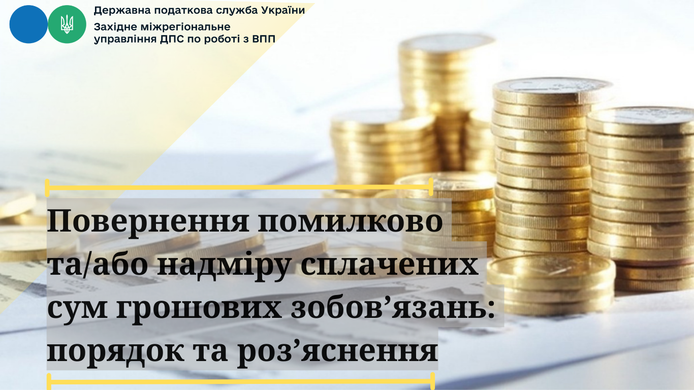 Західне міжрегіональне управління ДПС по роботі з великими платниками податків інформує, що відповідно до п.п. 14.1.115 п. 14.1 ст. 14 Податкового кодексу України від 02.12.2010 № 2755-VI (із змінами та доповненнями), надміру сплачені грошові зобов’язання – це суми коштів, зараховані на відповідний бюджет або на єдиний рахунок понад нараховані грошові зобов’язання, граничний строк сплати яких настав на певну дату.