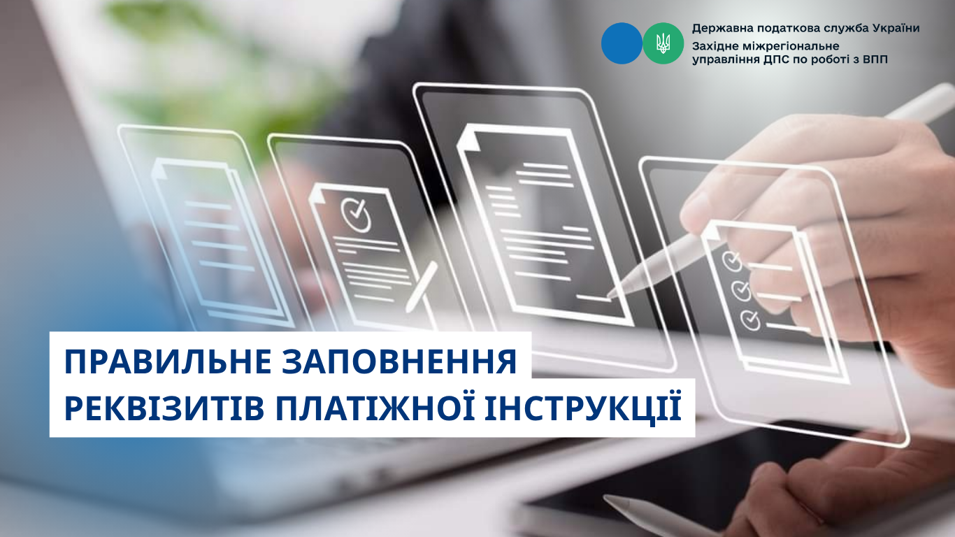 Західне міжрегіональне управління ДПС нагадує, що правила заповнення реквізиту «Призначення платежу» платіжної інструкції при сплаті податків, зборів, платежів та єдиного внеску на єдиний рахунок, визначені пунктами 1 – 4 розділу ІІ Порядку заповнення реквізиту «Призначення платежу» платіжної інструкції (платіжний документ) під час сплати (стягнення) податків, зборів, митних, інших платежів, єдиного внеску на загальнообов’язкове державне соціальне страхування, внесення авансових платежів (передоплати), грошової застави, а також у разі їх повернення, затвердженого наказом від 22.03.2023 № 148 (зі змінами), зареєстрованим в Міністерстві юстиції України 28.03.2023 за № 528/39584.