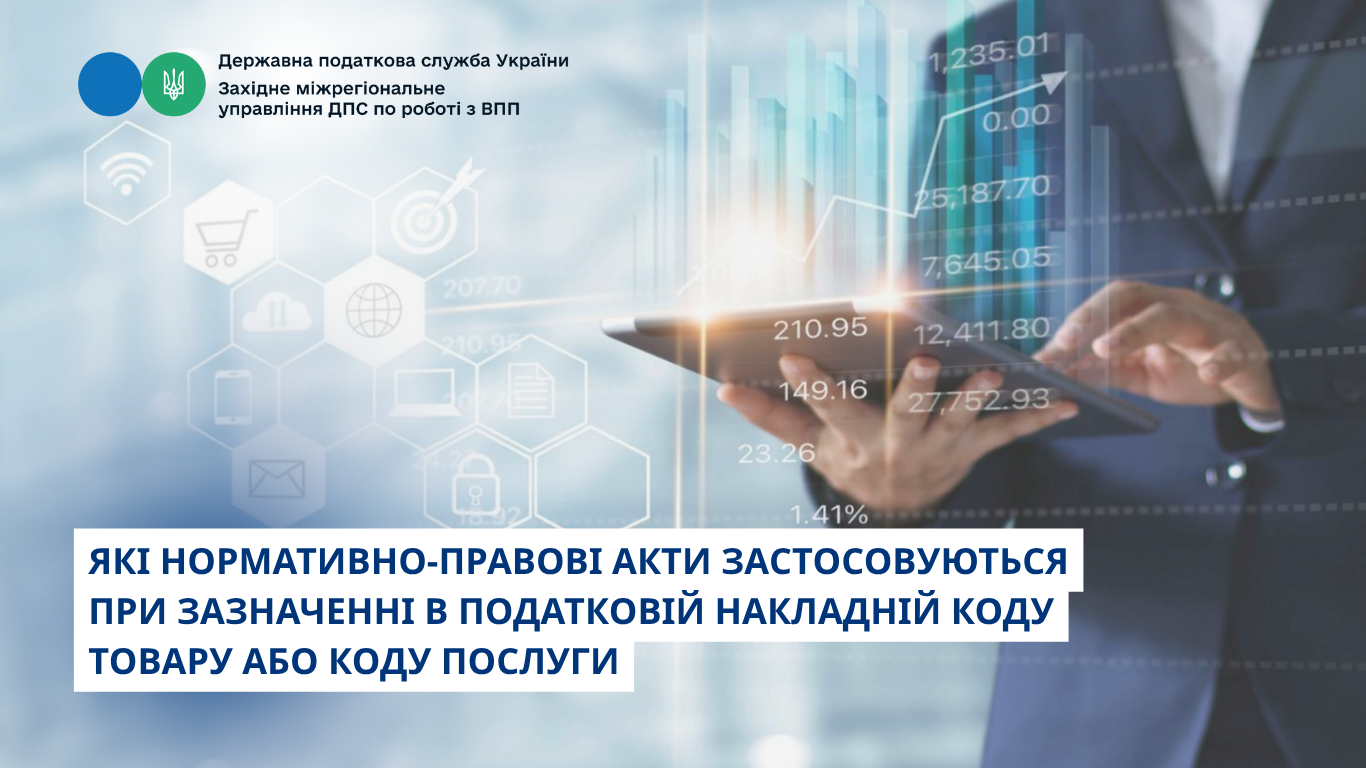 Західне міжрегіональне управління ДПС інформує, що відповідно до п.п. «і» п. 201.1 ст. 201 Податкового кодексу України у податковій накладній зазначаються в окремих рядках такі обов’язкові реквізити як код товару згідно з УКТ ЗЕД, для послуг – код послуги згідно з Державним класифікатором продукції та послуг; платники податків, крім випадків постачання підакцизних товарів та товарів, ввезених на митну територію України, мають право зазначати код товару згідно з УКТ ЗЕД або код послуги згідно з Державним класифікатором продукції та послуг неповністю, але не менше ніж чотири перших цифри відповідного коду.