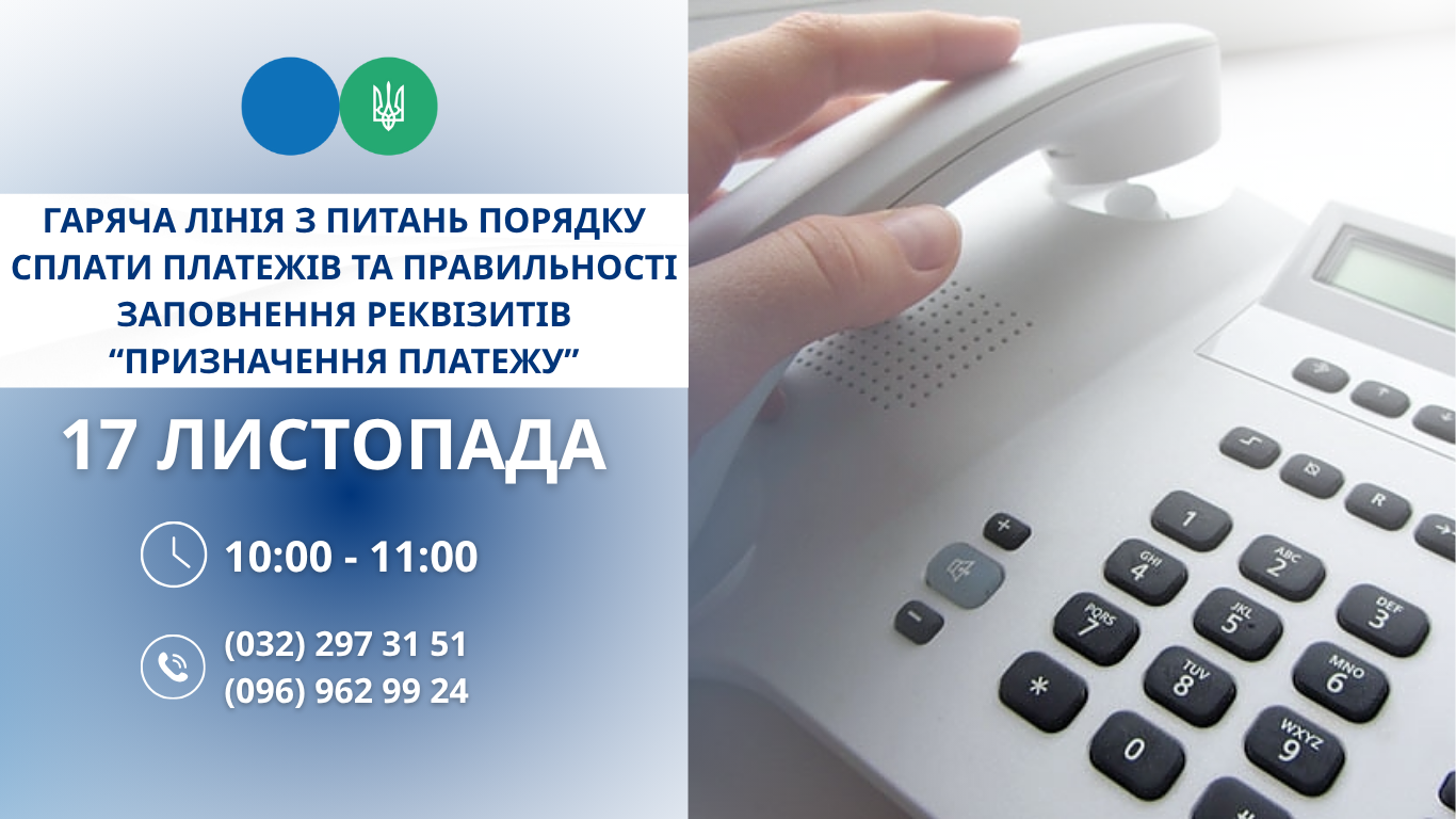 - Анонс "гарячої лінії" з питань порядку сплати платежів та правильності заповнення реквізитів "Призначення платежу": 17 листопада з 10:00 до 11:00