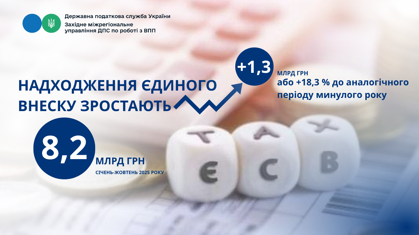 8,2 млрд гривень: саме таку суму єдиного внеску на загальнообов’язкове державне соціальне страхування сплатили великі платники Західного регіону упродовж січня – жовтня 2025 року. Це на 18,3 %, або на 1,3 млрд грн більше за аналогічний період минулого року. За січень – жовтень 2024 року надійшло