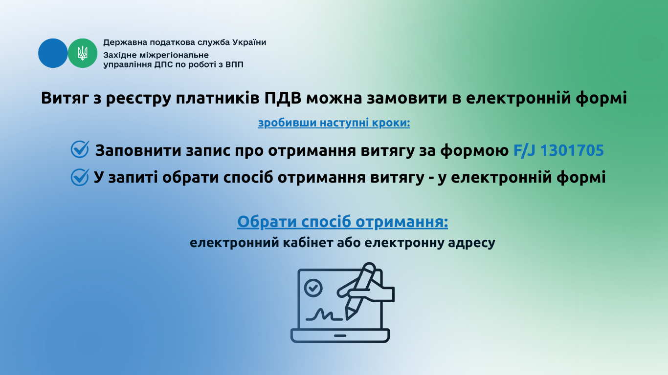 Західне міжрегіональне управління по роботі з великими платниками податків нагадує про можливість отримати витягу з реєстру платників ПДВ за формою J/F1301705. Платники можуть обрати зручний спосіб отримання витягу, у тому числі в електронній формі.