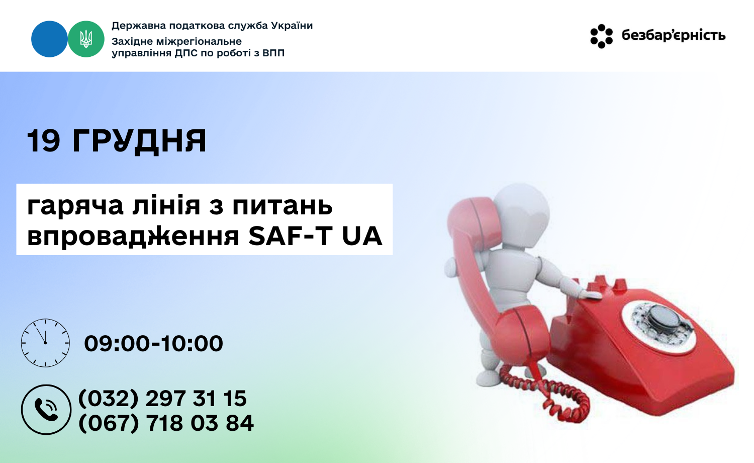 У п'ятницю, 19 грудня, з 09:00 год по 11:00 год у Західному міжрегіональному управління ДПС по роботі з великими платниками податків працюватиме "Гаряча лінія" з питань формування, направлення, отримання та опрацювання електронних документів у вигляді стандартного аудиторського файлу SAF-T UA.