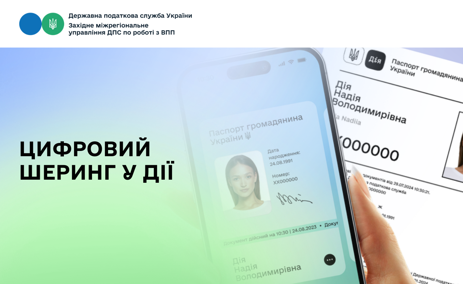 Західне МУ ДПС по роботі з ВПП повідомляє, що Державною податковою службою України забезпечено підключення інформаційно – комунікаційних систем ДПС до порталу Дія та розроблено програмне забезпечення, за допомогою якого посадовими особами ДПС під час надання адміністративних послуг (зокрема, під час проведення процедур реєстрації, внесення змін до Державного реєстру фізичних осіб – платників податків, а також під час видачі документа, що засвідчує реєстрацію у Державному реєстрі, та відомостей з Державного реєстру) у Центрах обслуговування платників здійснюється отримання (шеринг) електронних копій цифрових документів.
