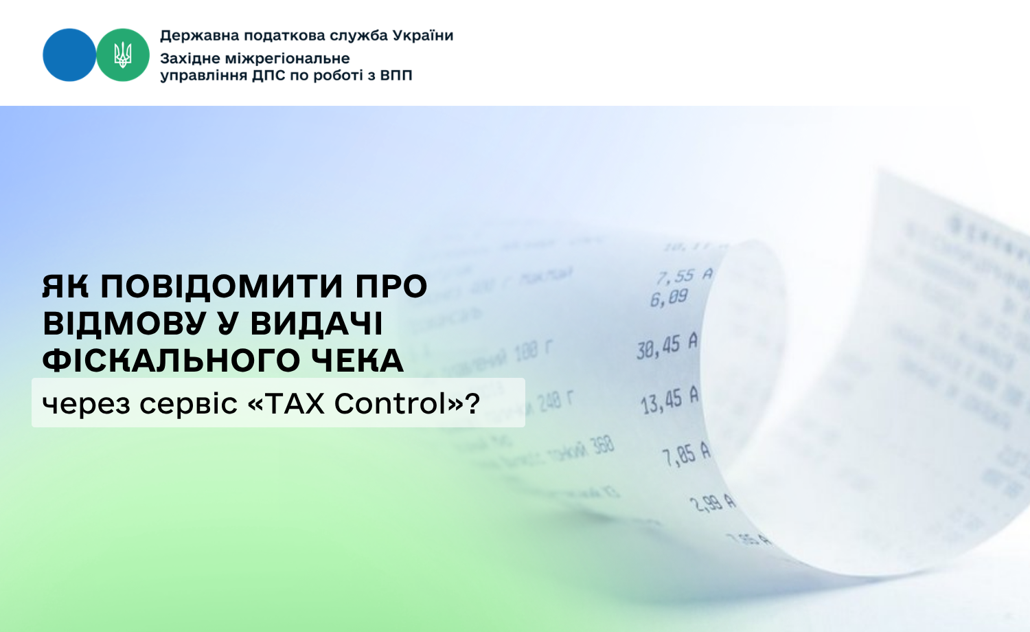 Західне міжрегіональне управління ДПС по роботі з великими платниками податків звертає увагу, що через цифровий сервіс «ТAX Control» покупці можуть повідомляти про відмову продавця видати фіскальний чек та інші порушення у сфері торгівлі, послуг чи громадського харчування.